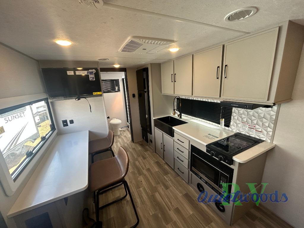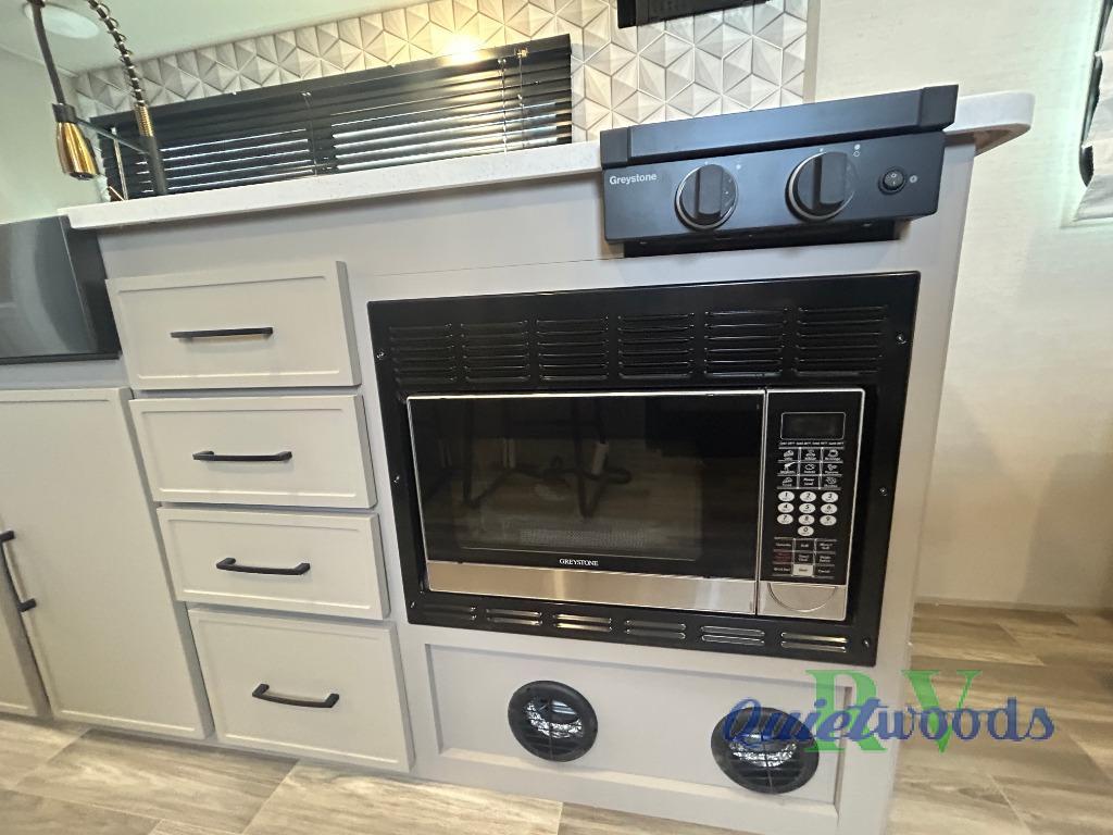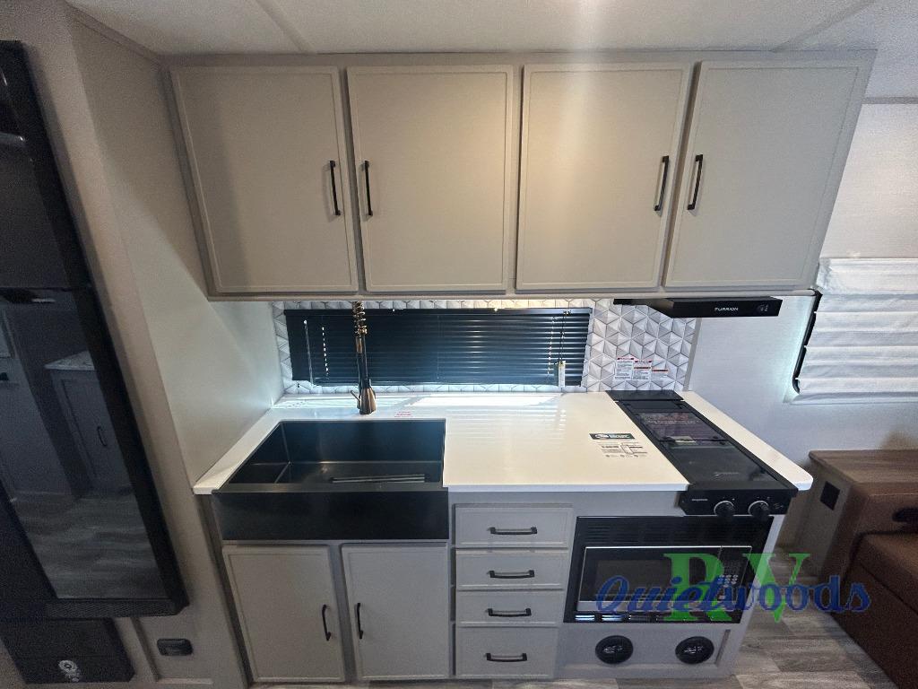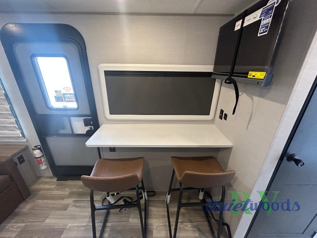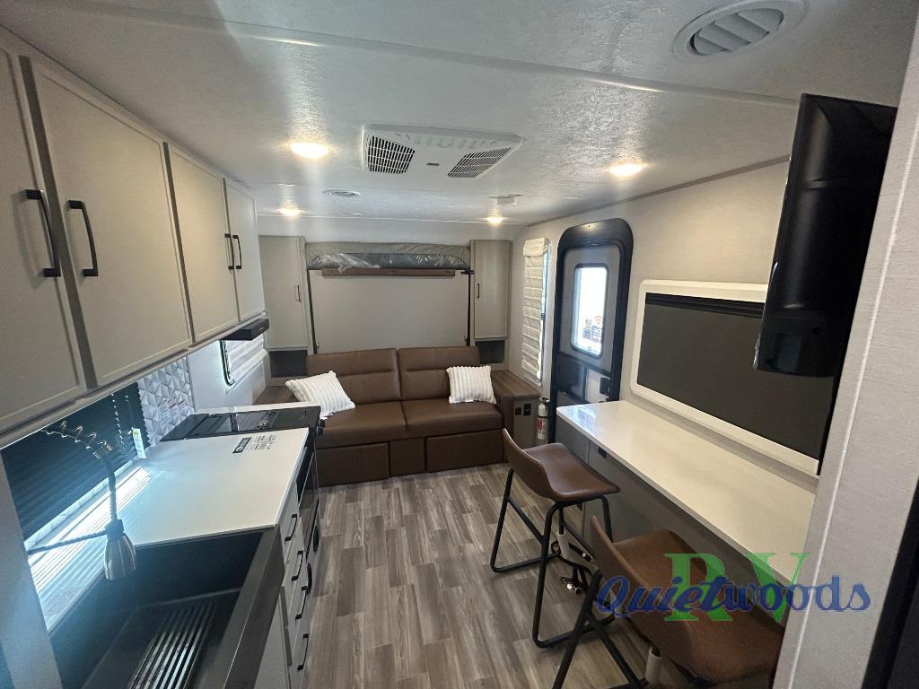 You will love camping every other weekend in this spacious travel trailer for three to four. There is a full rear bath with a spacious shower and medicine cabinet for your toiletries. You can relax on the jackknife sofa during the day and at night transform it into a Murphy bed. Easily prepare your meals in the kitchen on the three burner cooktop or in the oven. There is also an upgraded 10.7 cu. ft. residential refrigerator, plus a convection microwave oven for meals on the go. The bar top with two stools is the perfect place to enjoy your meals as you have a flip-open window to let in some fresh air. This model also includes an outside kitchen with an induction cooktop, a 14' power awning, plus an outside spray port for convenience!