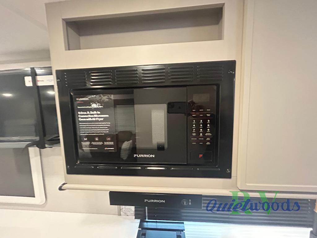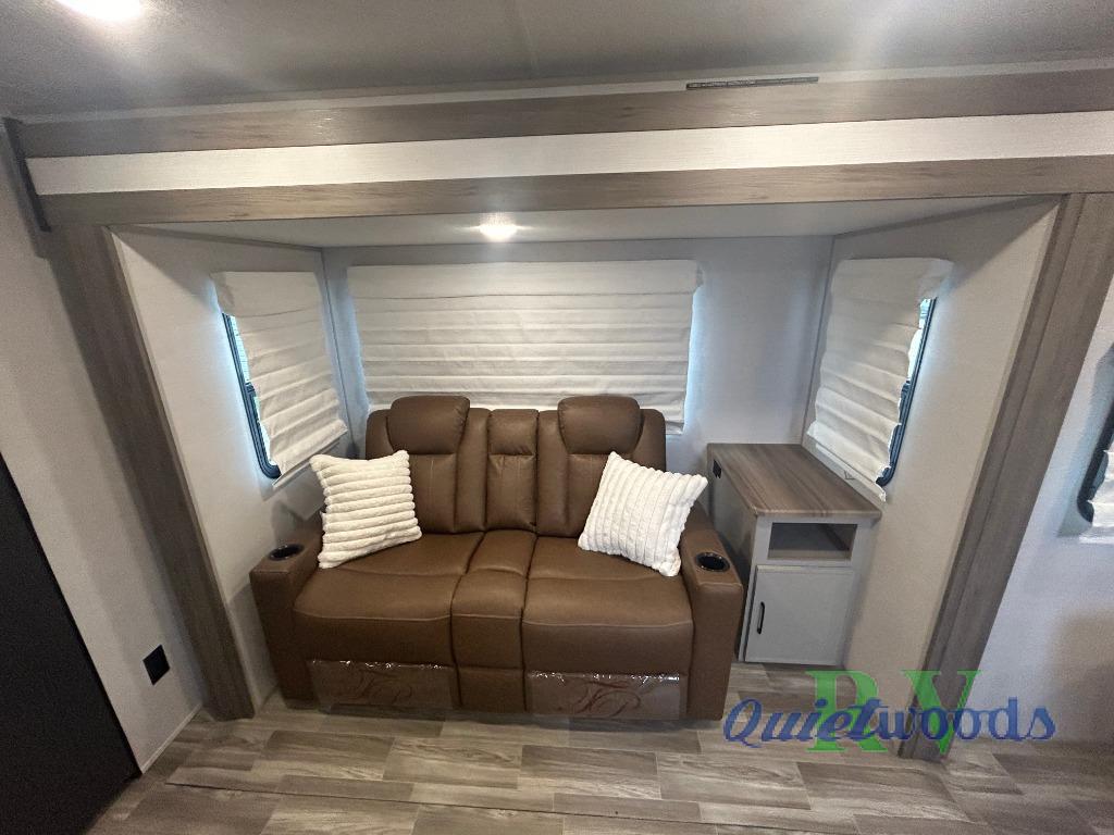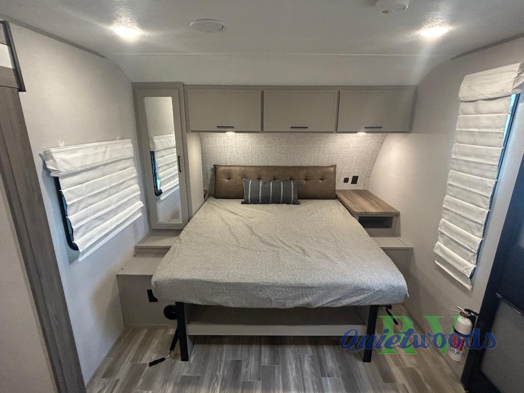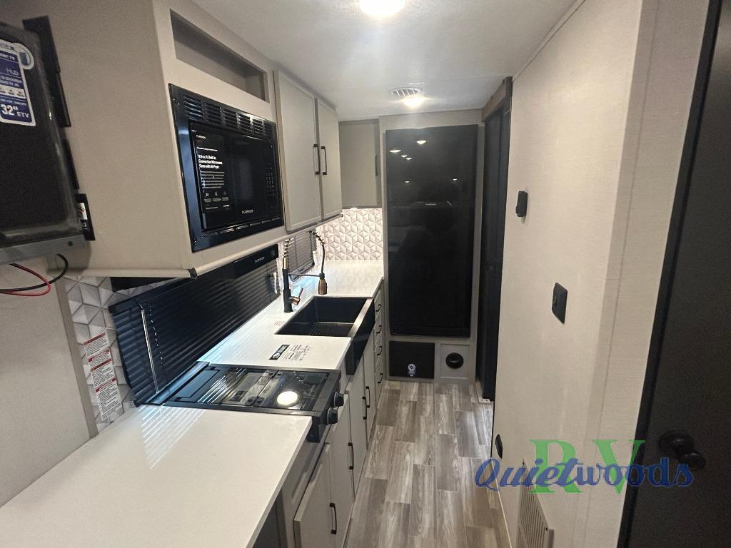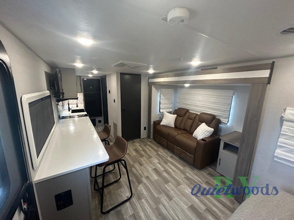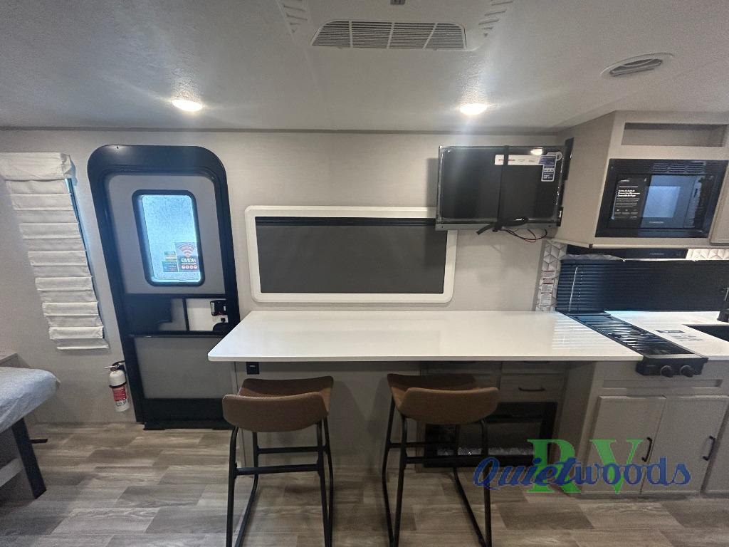 Escape to your favorite campground with your favorite person in this travel trailer! Whether you're cooking on the outside kitchen or indoors in the rear corner kitchen, you will have all the appliances needed for yummy meals each day. There is even an air fryer for added convenience. Enjoy your meals at the bar top with two bar stools looking out through the flip-open window. The living area has a theater seating slide to provide comfortable seating space during the day, and a wardrobe next to it to store your items. You will get a good night's rest each night on the front RV queen bed, and the rear corner bathroom has a 36" x 24" shower to freshen up in the mornings. This model also includes tons of storage space for all your belongings with an exterior large pass-through storage area!
