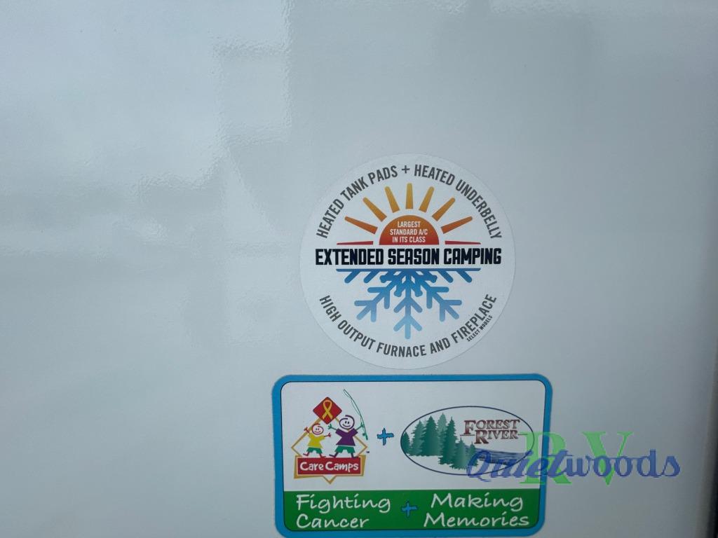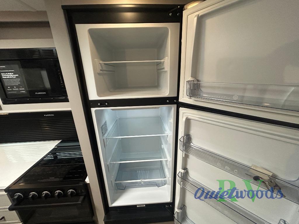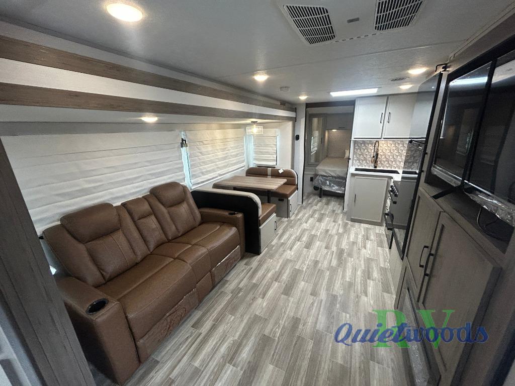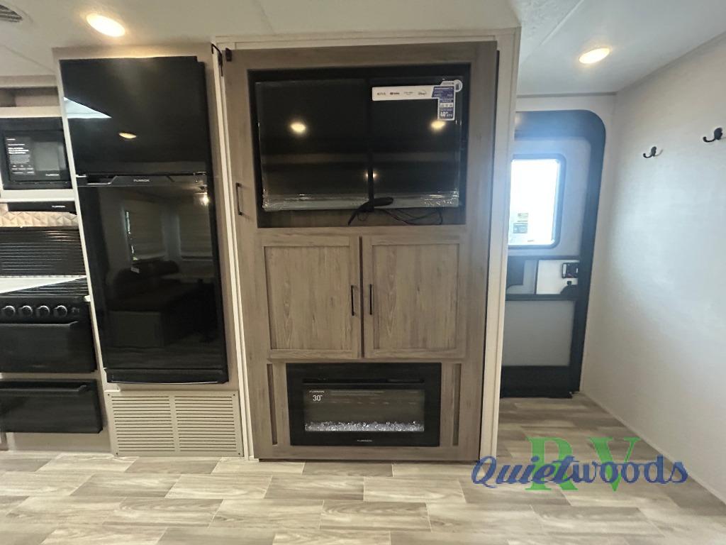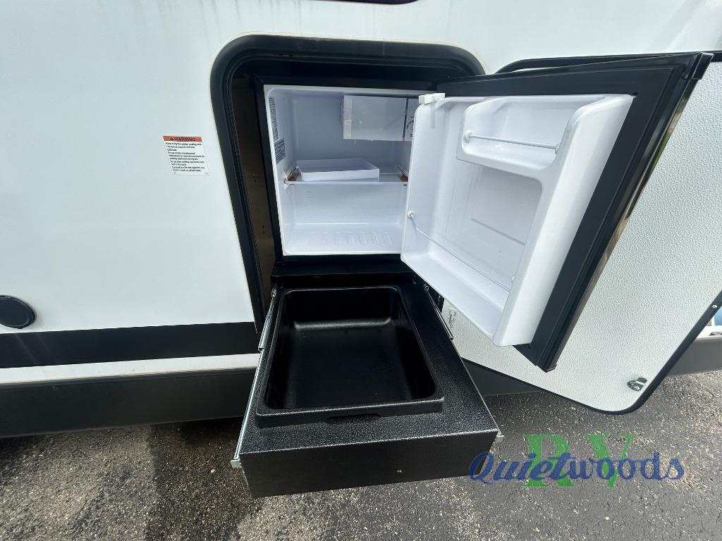 You will love camping every other weekend in this spacious travel trailer for three to four. There is a full rear bath with a spacious shower and two linen closets for towels and toiletries. Your crew can get comfortable on the theater seating across from the entertainment center, and it even swings open to reveal hidden storage with shelves. Easily prepare your meals in the kitchen on the three burner cooktop, or in the oven. There is also an upgraded 10.7 cu. ft. residential refrigerator, plus a microwave and air fryer for meals on the go. When you're ready to call it a night, the front private bedroom is sure to provide comfort with its queen bed, dual wardrobes, and underbed storage. This model also includes an outside kitchen with an induction cooktop, a 20' power awning, plus Sure-Step entry steps for convenience!