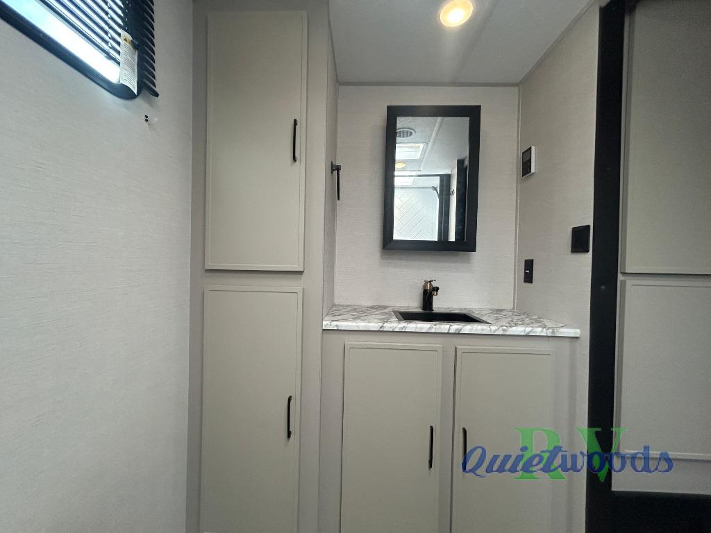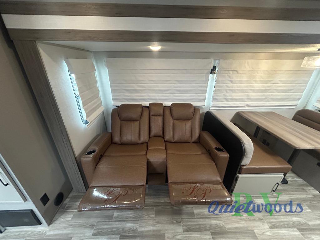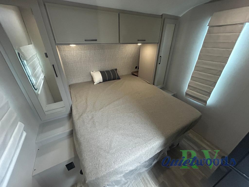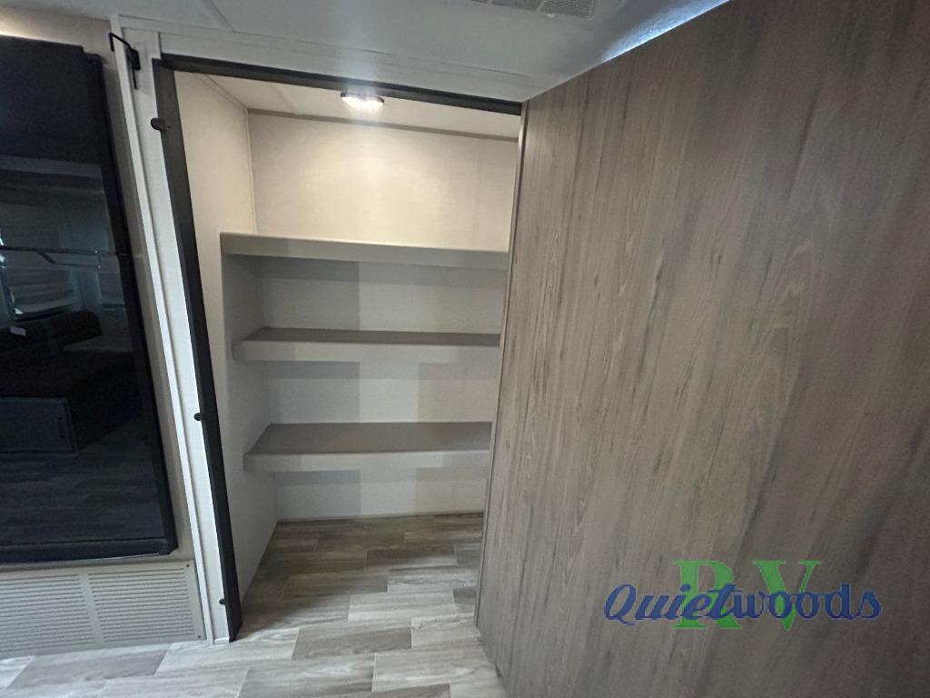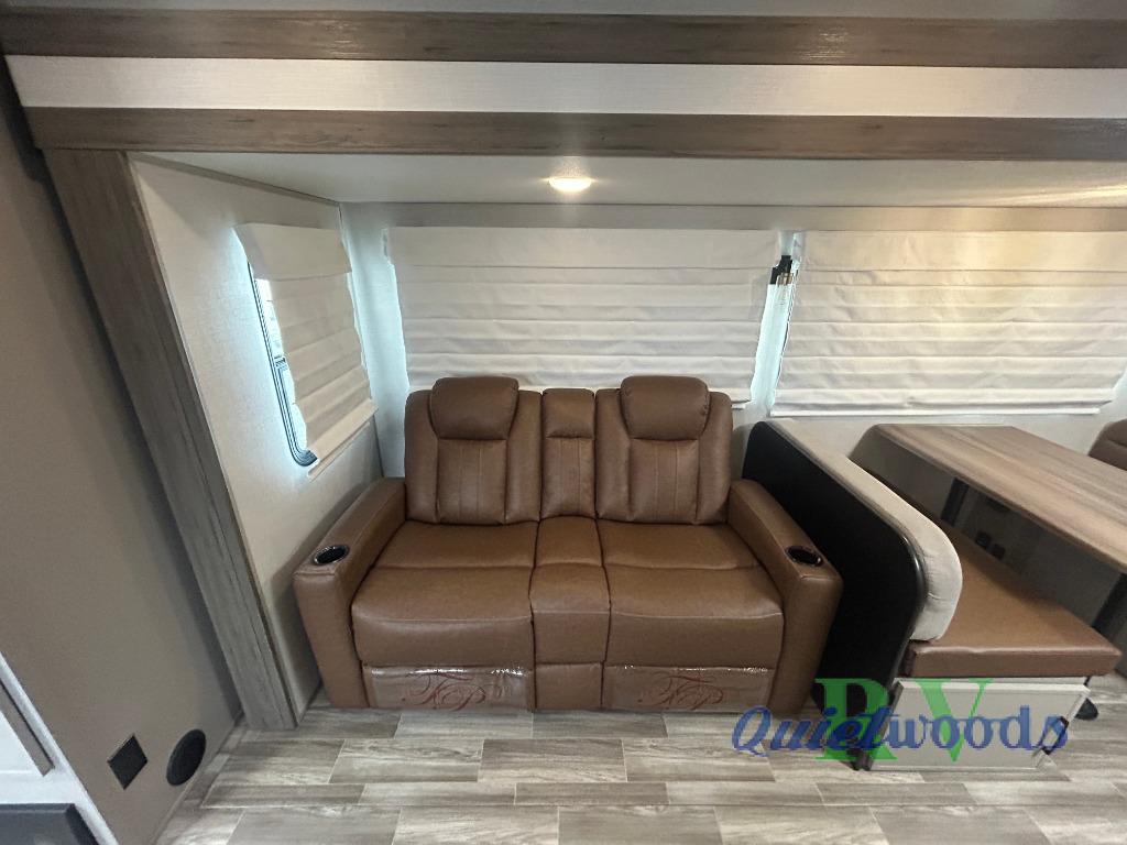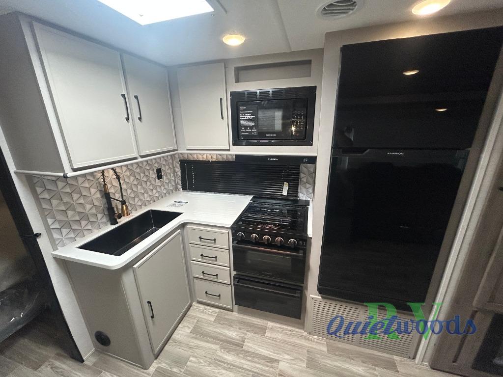 You will love camping every other weekend in this spacious travel trailer for three to four. There is a full rear bath with a spacious shower and two linen closets for towels and toiletries. Your crew can get comfortable on the theater seating across from the entertainment center, and it even swings open to reveal hidden storage with shelves. Easily prepare your meals in the kitchen on the three burner cooktop, or in the oven. There is also an upgraded 10.7 cu. ft. residential refrigerator, plus a microwave and air fryer for meals on the go. When you're ready to call it a night, the front private bedroom is sure to provide comfort with its queen bed, dual wardrobes, and underbed storage. This model also includes an outside kitchen with an induction cooktop, a 20' power awning, plus Sure-Step entry steps for convenience!