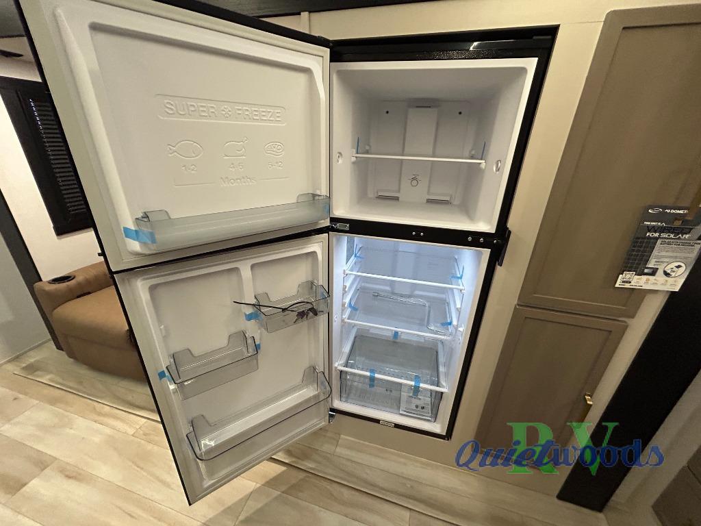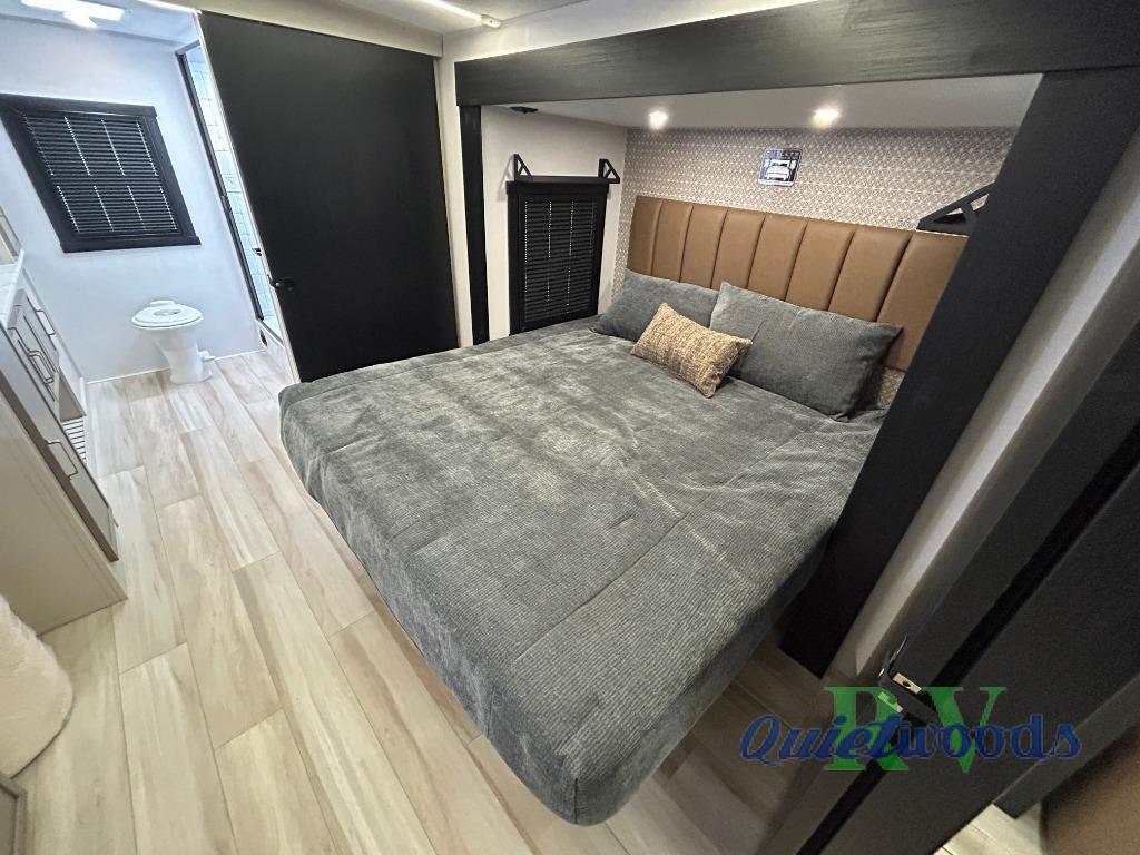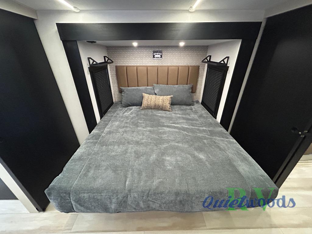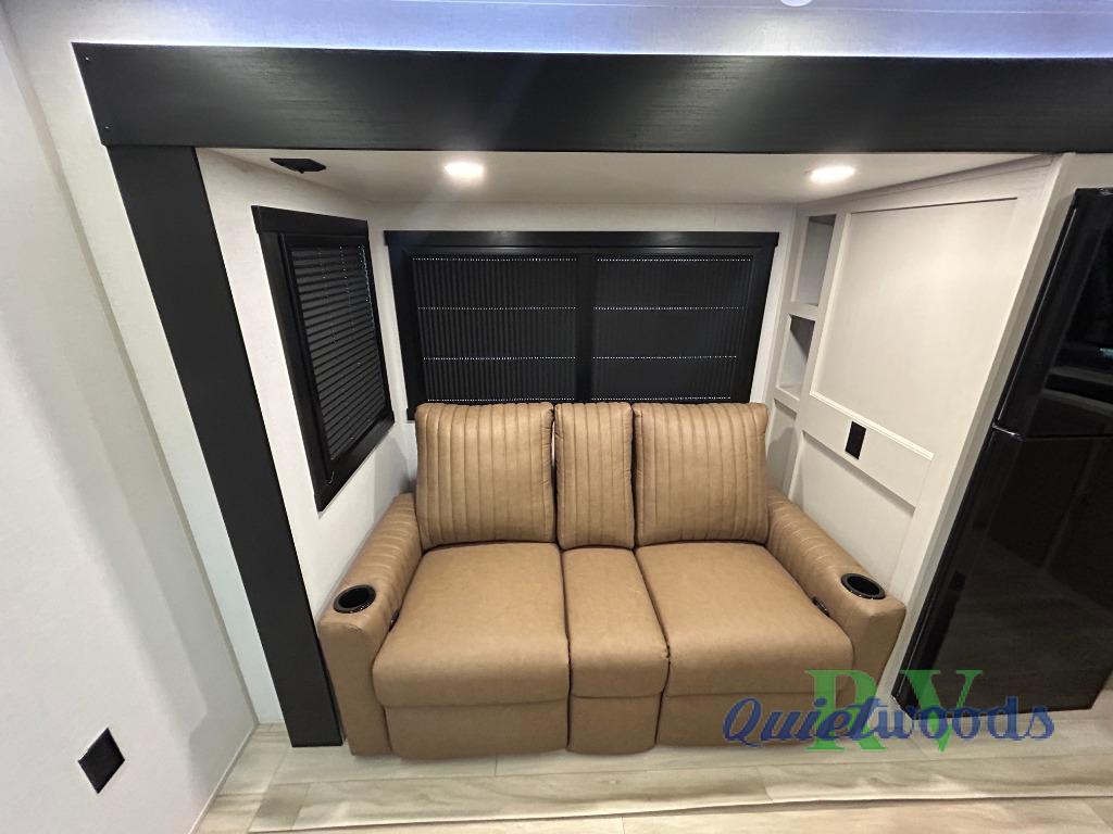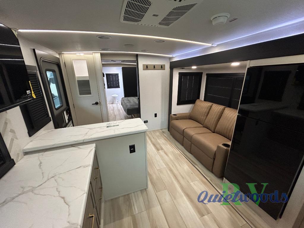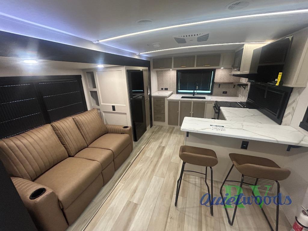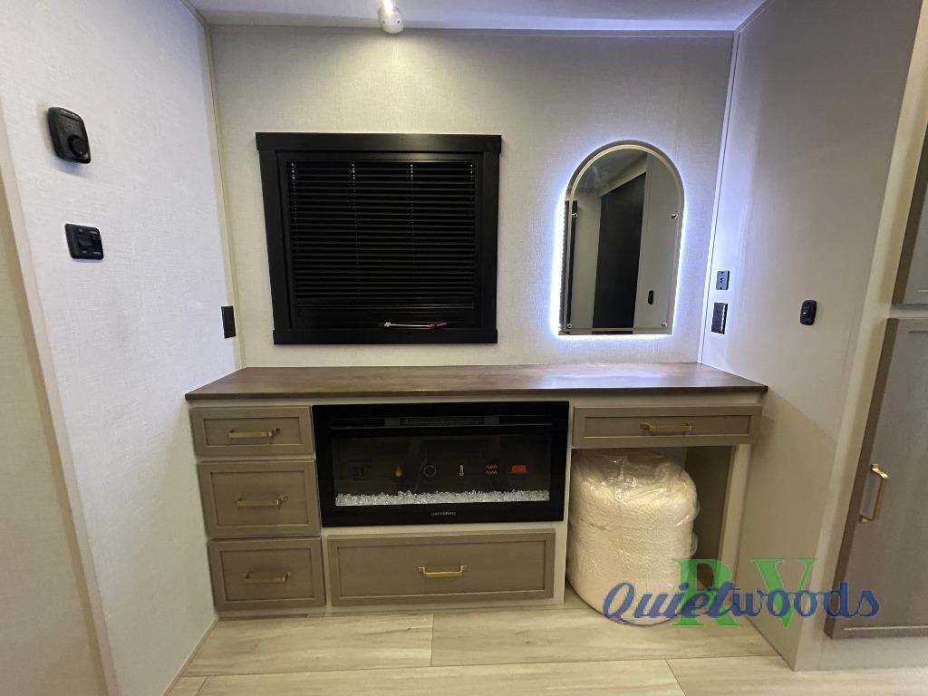 You'll love every minute spent in this double slide out, couple's trailer! You can wake up refreshed each day on your king bed, and enjoy great outdoor views with the bedroom panoramic window. There is also a dresser with a fireplace for a more cozy feel, and the full rear bath includes dual bath sinks plus a walk-in shower to freshen up in. Washer and dryer connections are also located here so you can choose to add those appliances if you wish. The main living area includes a 67" theater seat, no carpet for easy cleaning, and ample counter space in the front kitchen. There is also a bar top with two seats, and plenty of storage space for all your belongings.