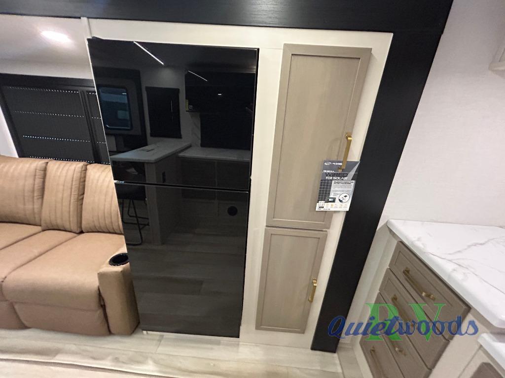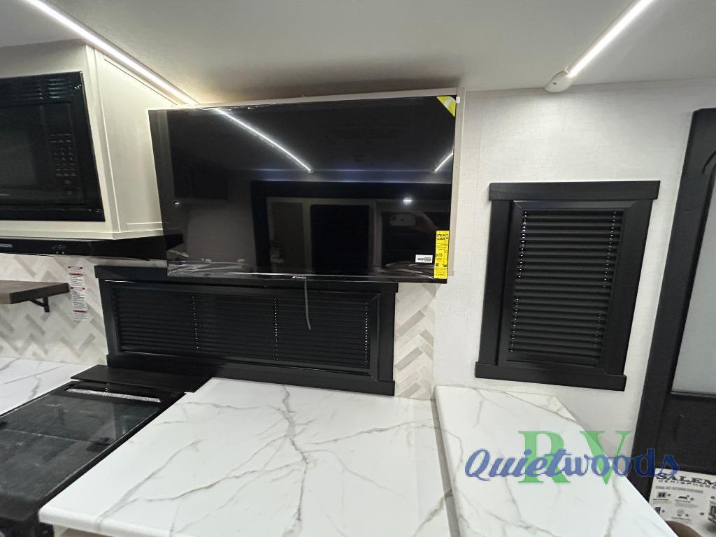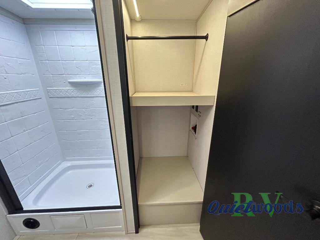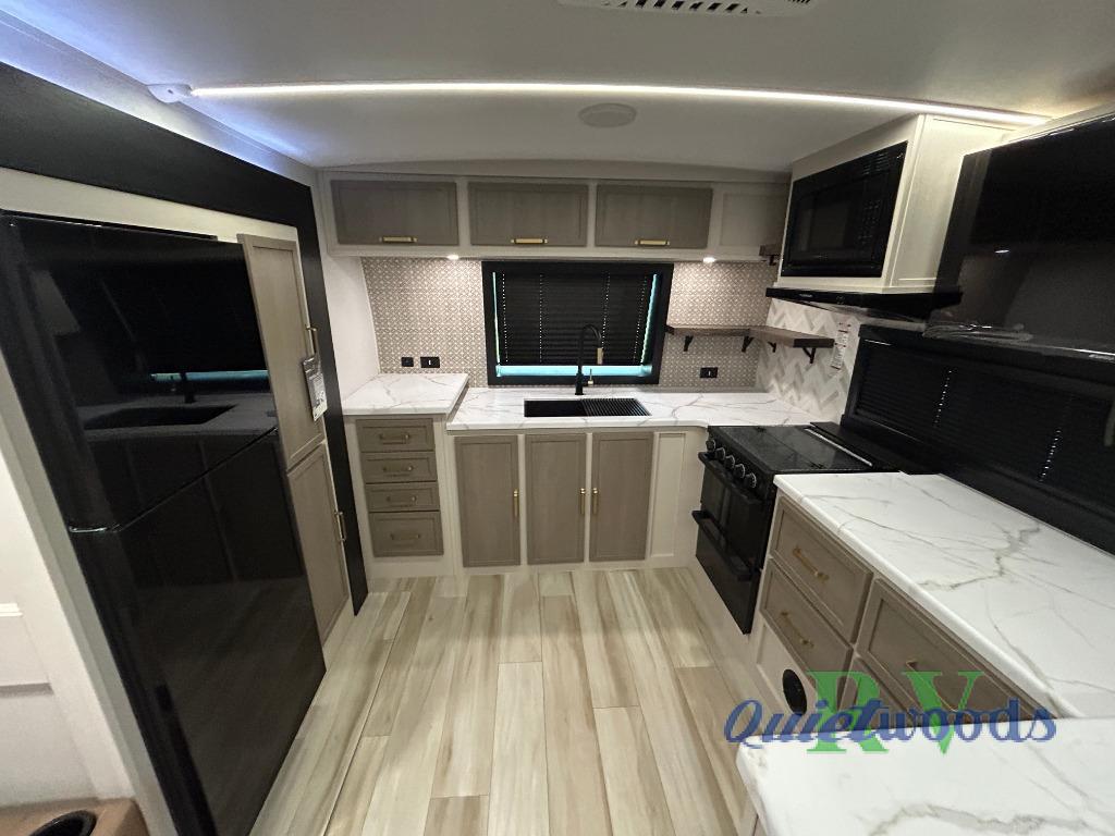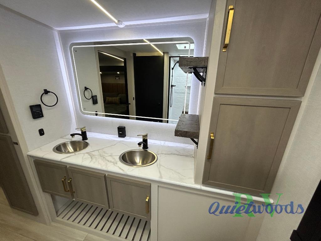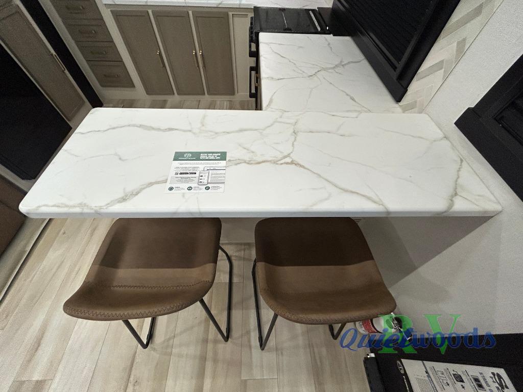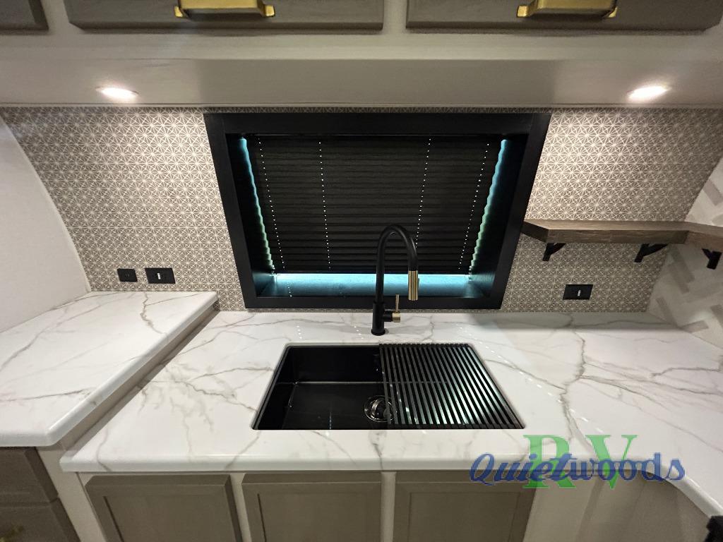 You'll love every minute spent in this double slide out, couple's trailer! You can wake up refreshed each day on your king bed, and enjoy great outdoor views with the bedroom panoramic window. There is also a dresser with a fireplace for a more cozy feel, and the full rear bath includes dual bath sinks plus a walk-in shower to freshen up in. Washer and dryer connections are also located here so you can choose to add those appliances if you wish. The main living area includes a 67" theater seat, no carpet for easy cleaning, and ample counter space in the front kitchen. There is also a bar top with two seats, and plenty of storage space for all your belongings.
