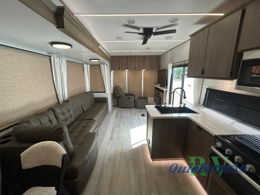 While you spend your afternoon relaxing on the L-shaped sofa or lounge chair in this Wildwood Lodge destination trailer, you can switch on the ceiling fan for an additional breeze. The free standing dinette is another great spot to sit down while you put together a puzzle or play a board game, and since the kitchen is also included in this space, you can work on dinner while still being a part of everyone else's activities. The bathroom is decked out with a walk-in shower and linen closet, and the private bedroom also has plenty of convenience with its king bed slide, closet with optional washer and dryer prep, and the second exterior entry door.