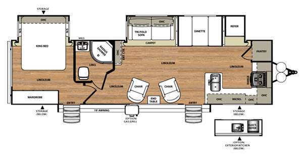 As you enter the front entrance, to the right is the kitchen with a double kitchen sink, microwave, three burner range, and large pantry. The slide has a refrigerator, dinette, and tri-fold sofa. Next to the sofa you will find an entertainment center. On the opposite side, in the living area there are two lounge chairs and an end table.