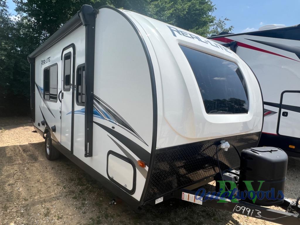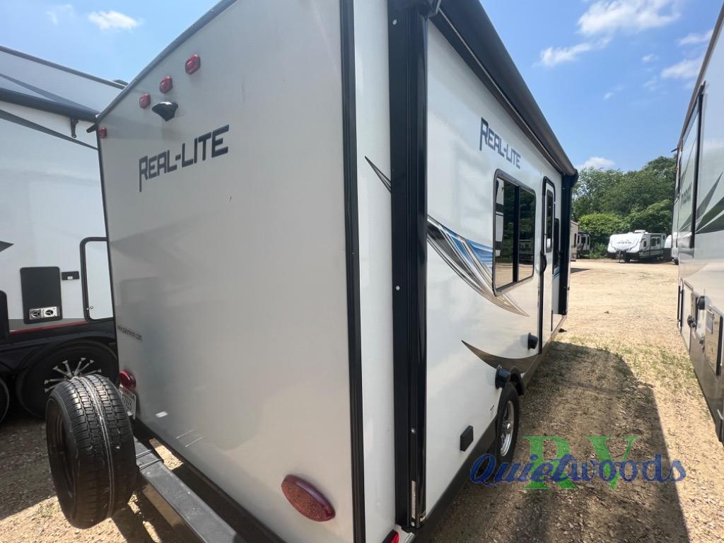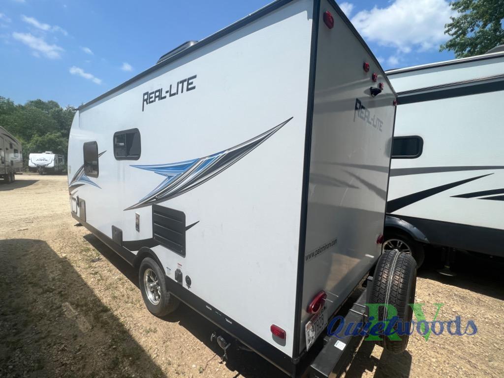 You will find it easy to create lifetime memories in this Real-Lite Mini travel trailer because of all of the comfortable amenities it includes at an affordable price. The kitchen is fully stocked with a two-burner cooktop and microwave oven for those evenings you want to cook or just pop some popcorn for a snack. You'll love the rear bathroom that is secluded for added privacy. This unit features a queen bed at the front of the trailer, plus a 30" x 70" dinette that can fold down to hold an extra guest. Let the adventure begin with this travel trailer today!