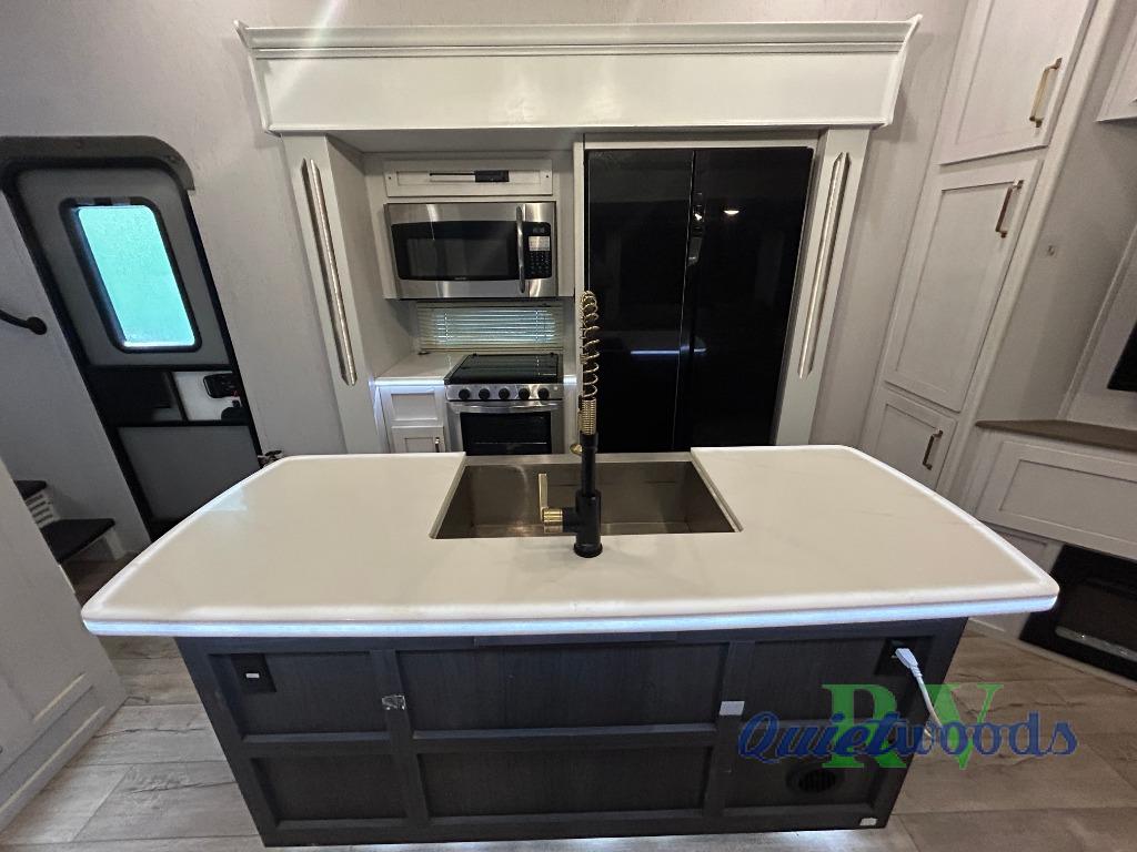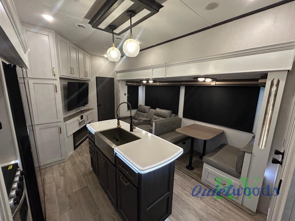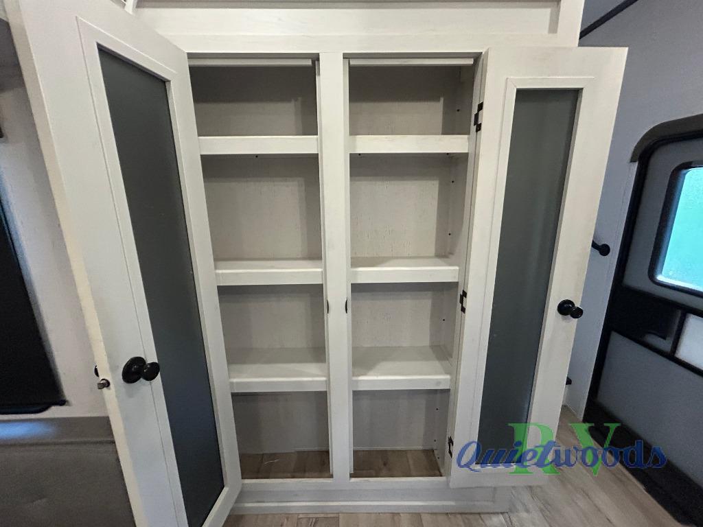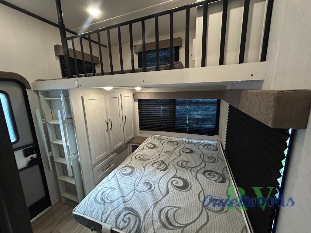 You will experience a smooth flow of traffic in and out of this fifth wheel with dual entry doors! One of the entrances even leads into the rear private bedroom which also has a 54" x 74" loft bed for storage or sleeping space, plus its very own half bathroom which will come in handy at night. The chef will enjoy preparing and serving meals using the kitchen island and all the amenities inside, plus they will enjoy cooking at the outdoor kitchen when wanting to be outside with everyone. Inside, there is a large pantry that is big enough to store everyone's favorite snacks, and the booth dinette offers a comfortable place to eat your meals or play card games. And the full bathroom has a dual sink vanity for two to get ready at once. When you're ready to wind down your nights, head to the front private bedroom and relax on the king bed slide!