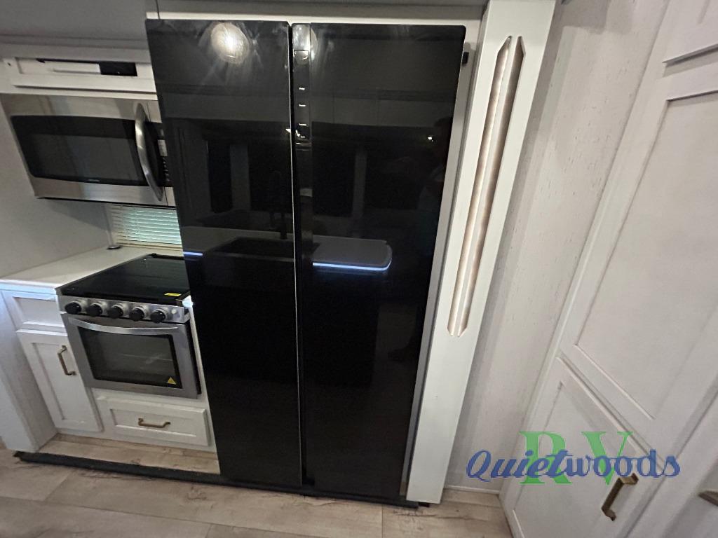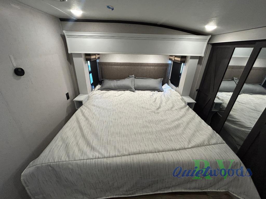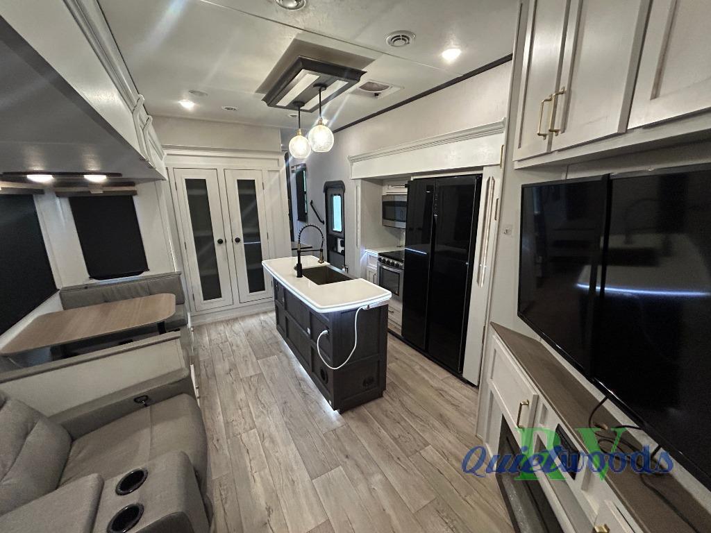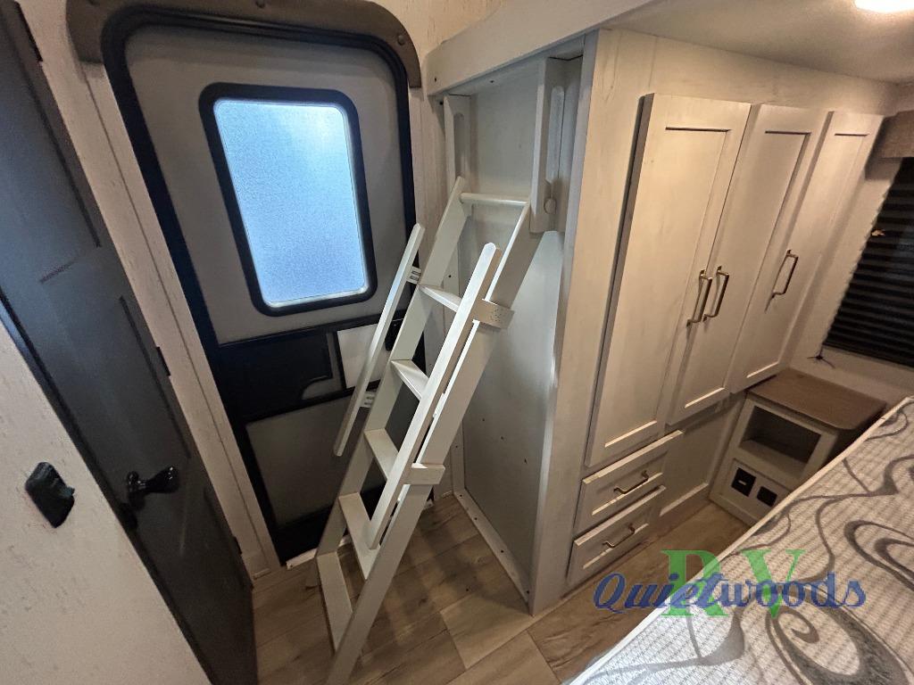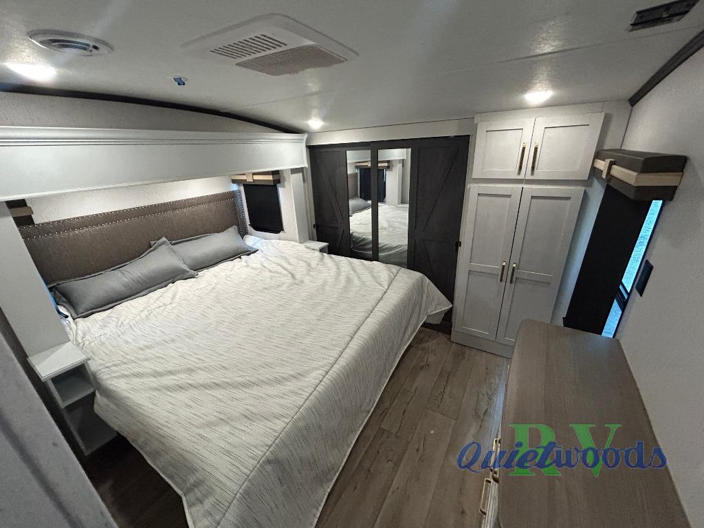 You will experience a smooth flow of traffic in and out of this fifth wheel with dual entry doors! One of the entrances even leads into the rear private bedroom which also has a 54" x 74" loft bed for storage or sleeping space, plus its very own half bathroom which will come in handy at night. The chef will enjoy preparing and serving meals using the kitchen island and all the amenities inside, plus they will enjoy cooking at the outdoor kitchen when wanting to be outside with everyone. Inside, there is a large pantry that is big enough to store everyone's favorite snacks, and the booth dinette offers a comfortable place to eat your meals or play card games. And the full bathroom has a dual sink vanity for two to get ready at once. When you're ready to wind down your nights, head to the front private bedroom and relax on the king bed slide!
