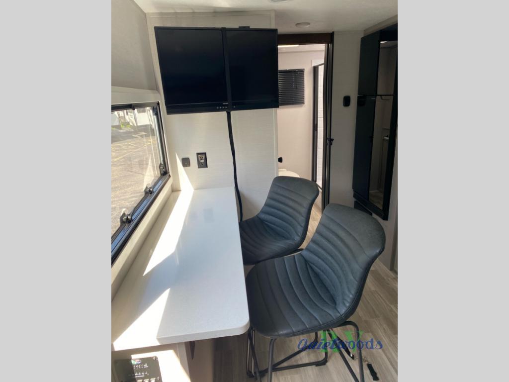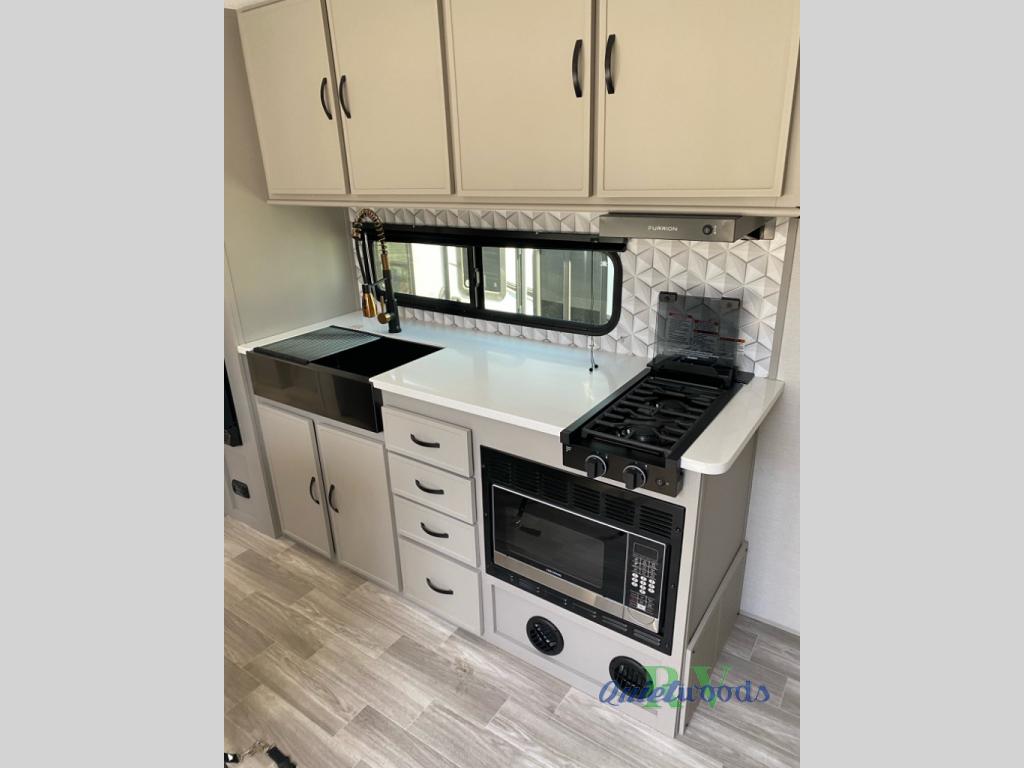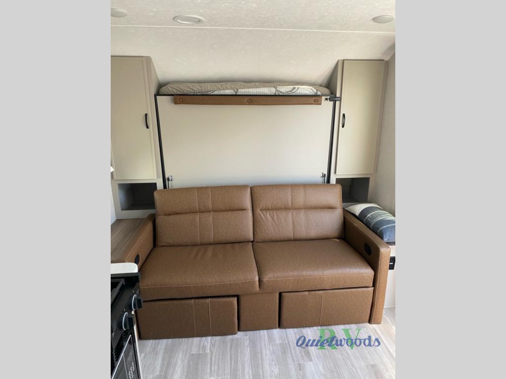 You will love camping every other weekend in this spacious travel trailer for three to four. There is a full rear bath with a spacious shower and medicine cabinet for your toiletries. You can relax on the jackknife sofa during the day and at night transform it into a Murphy bed. Easily prepare your meals in the kitchen on the three burner cooktop or in the oven. There is also an upgraded 10.7 cu. ft. residential refrigerator, plus a convection microwave oven for meals on the go. The bar top with two stools is the perfect place to enjoy your meals as you have a flip-open window to let in some fresh air. This model also includes an outside kitchen with an induction cooktop, a 14' power awning, plus an outside spray port for convenience!